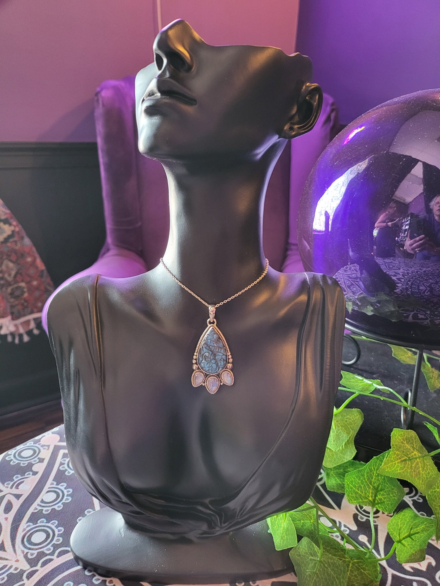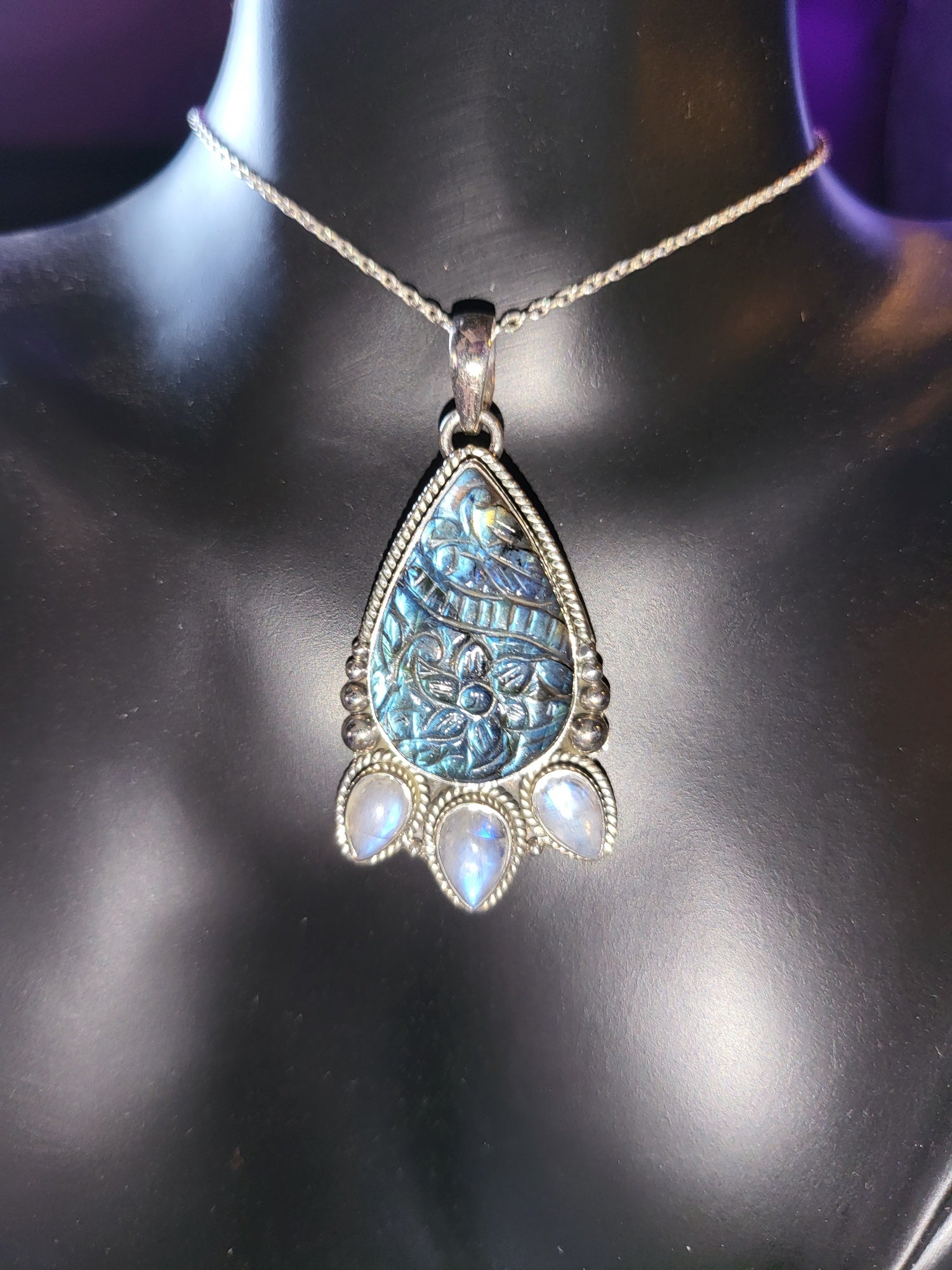 Carved Labradorite & 3 drop moonstone silver necklace