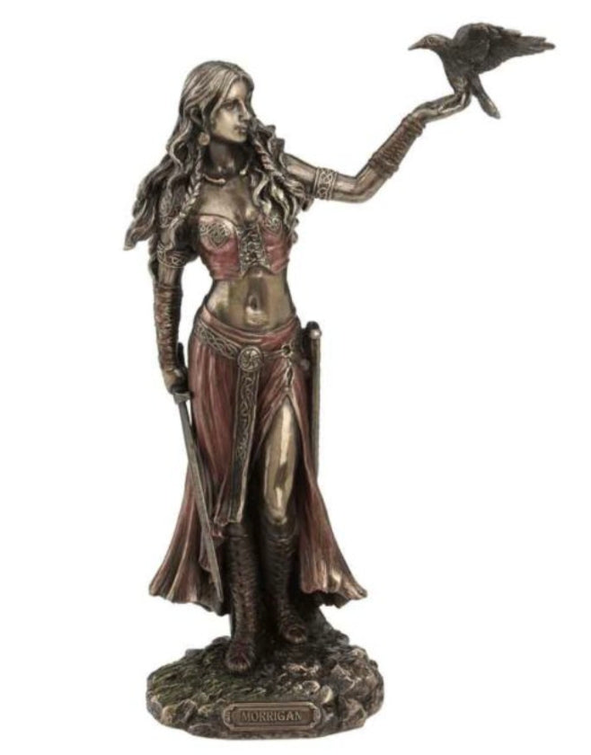 Honor the fierce and mysterious power of The Morrigan, Celtic goddess of war, fate, death, and prophecy. This 11-inch cold cast bronze statue depicts the Phantom Queen in commanding detail, often shown with her sacred raven—symbolizing transformation, protection, and the veil between worlds.