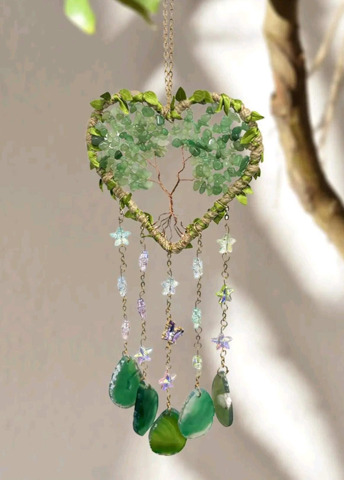 This radiant heart-shaped suncatcher features a handcrafted Tree of Life made from twisted copper wire, symbolizing deep roots, spiritual growth, and connection. The tree is adorned with natural Aventurine chips, known for attracting luck, prosperity, and emotional healing.