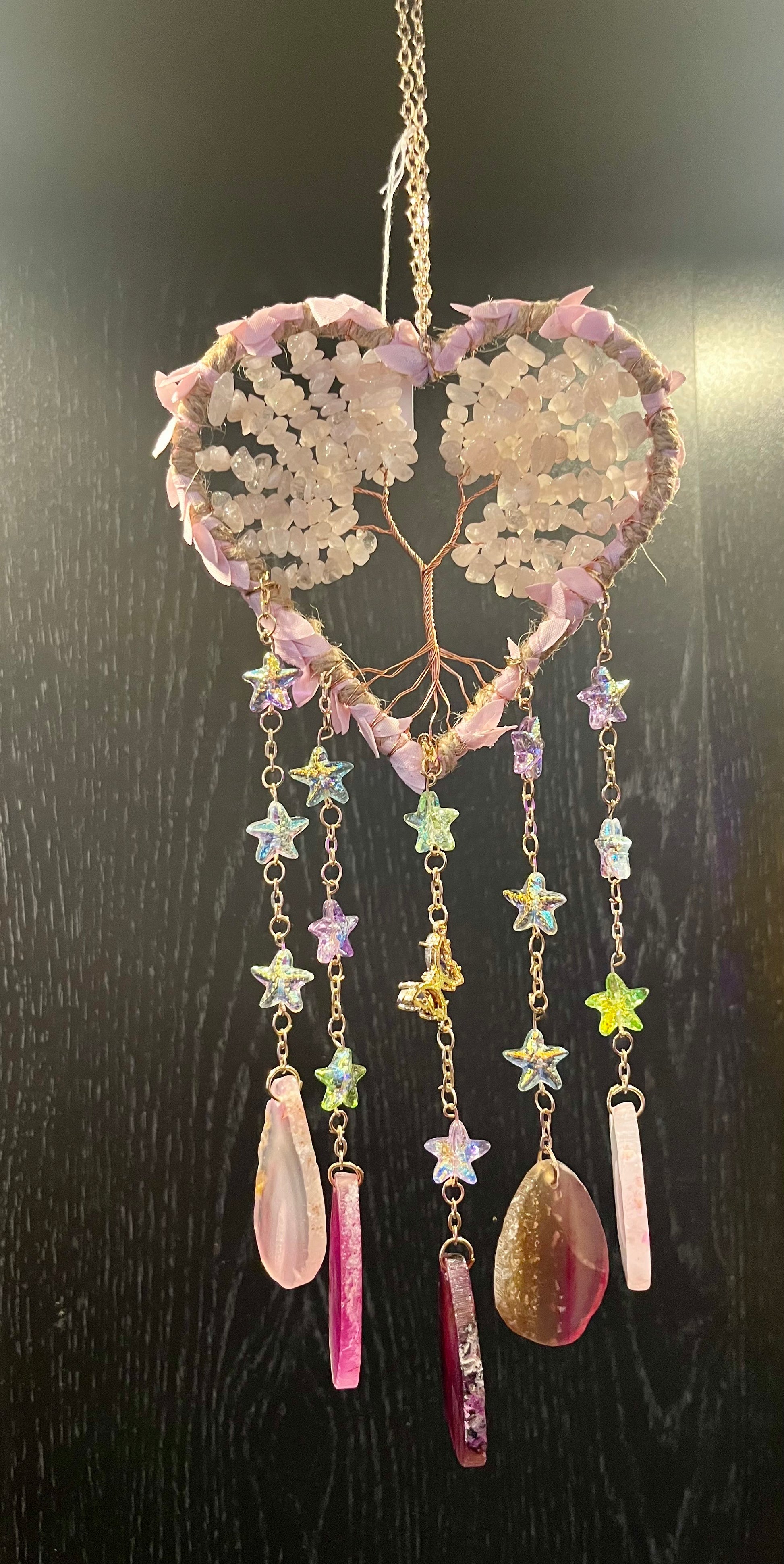 Heart-Shaped Tree of Life Suncatcher – Rose Quartz & Copper