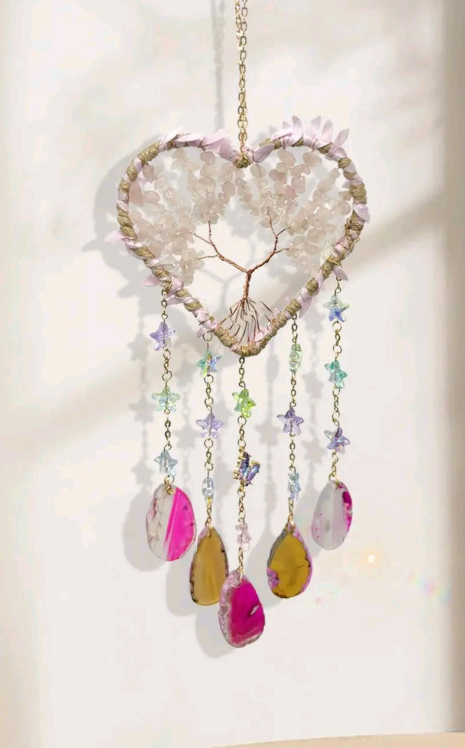 Dangling from the base are soft pink slices and delicate charms that catch the light, infusing your space with warmth, peace, and a loving glow.