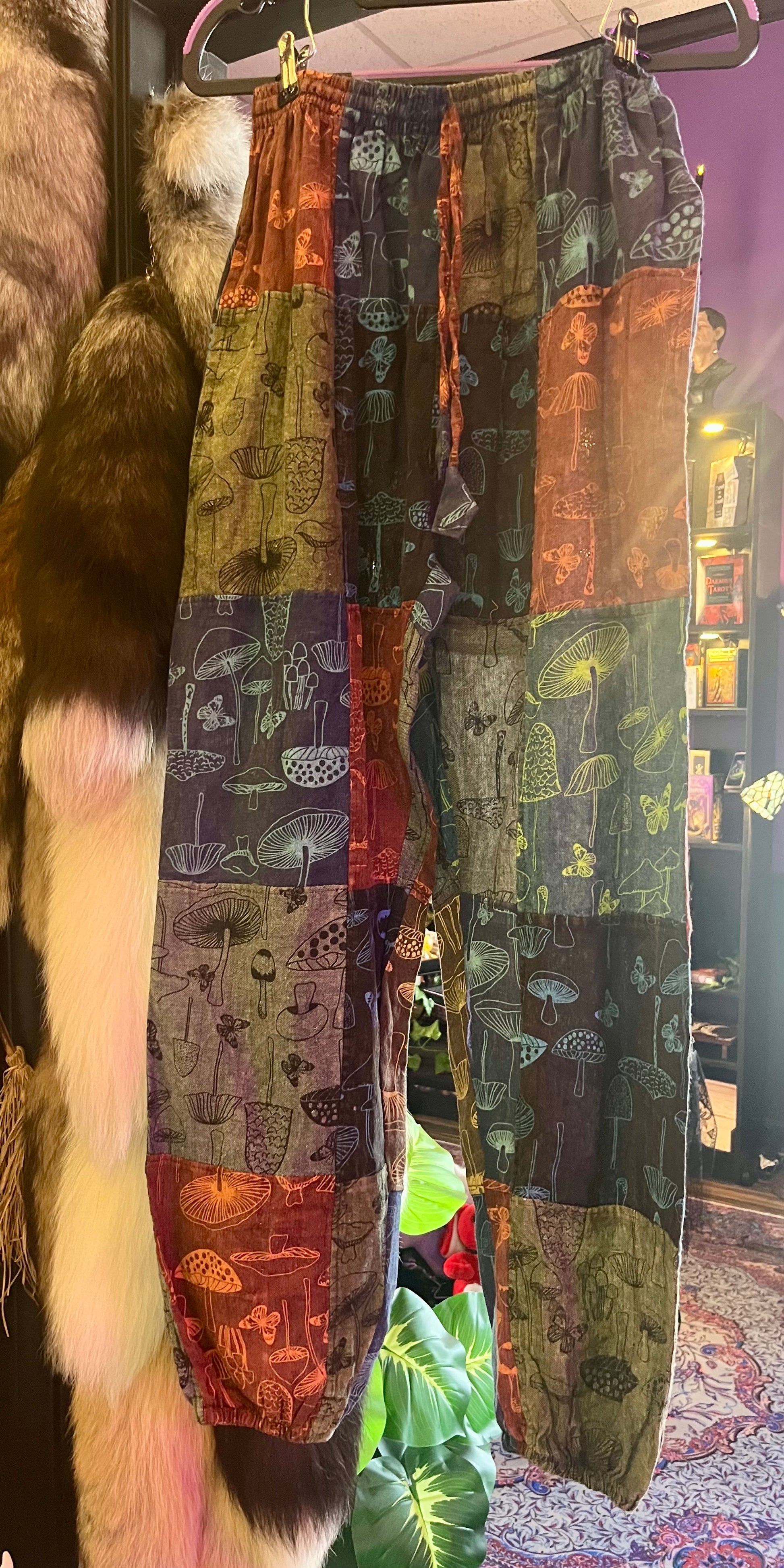 Wander wild and free in these 100% cotton harem pants, bursting with color, comfort, and a touch of forest magic. Each pair features vibrant patchwork panels printed with playful multi-color mushrooms—symbols of transformation, grounding, and the unseen realms.