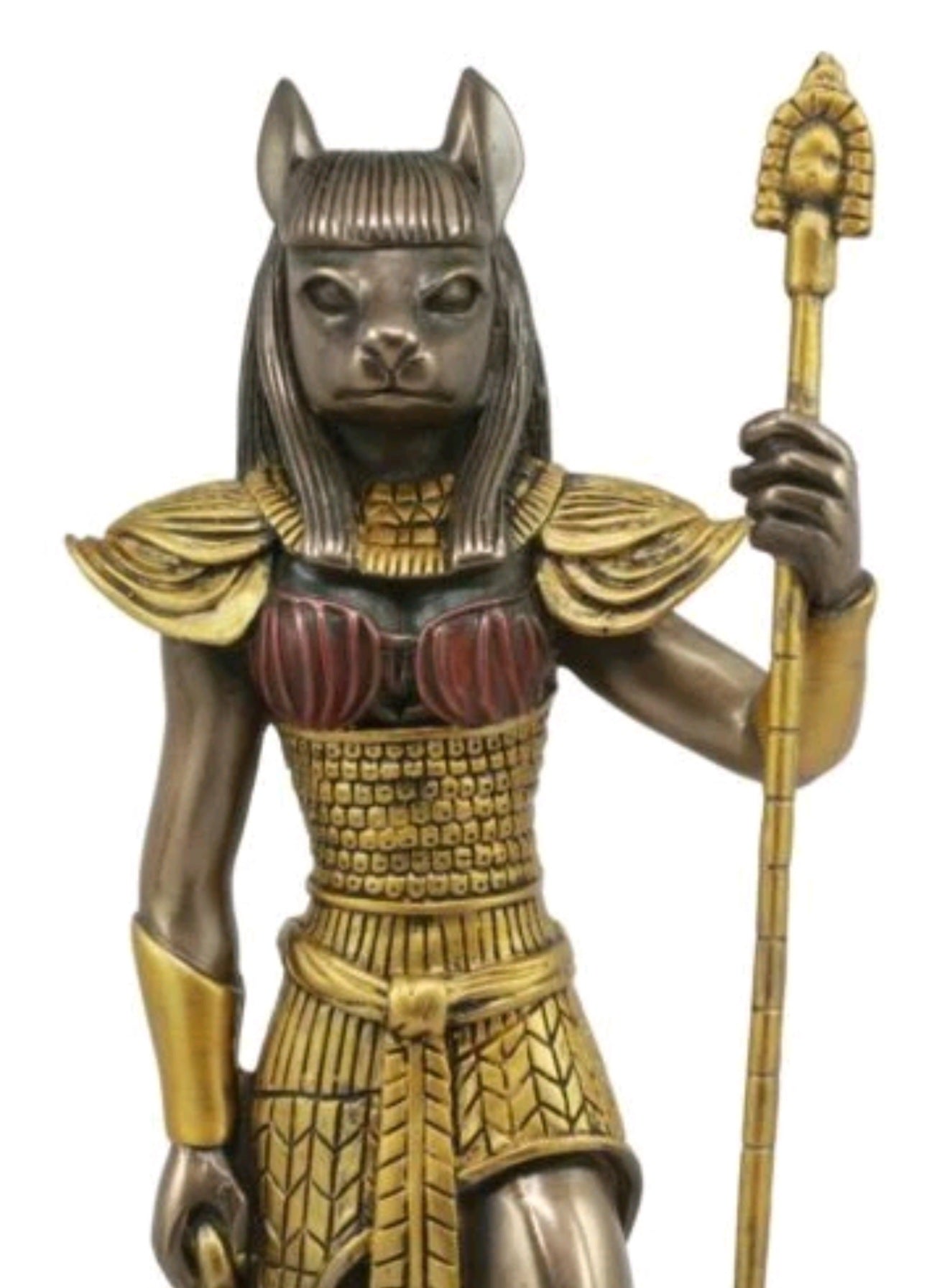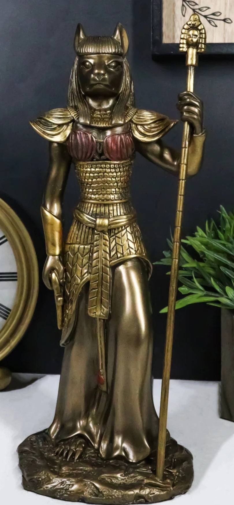 This striking statue honors Bastet, the ancient Egyptian goddess of protection, home, fertility, and feline grace. Standing 10 5/8 inches tall and crafted in cold cast bronze, she radiates a powerful yet elegant presence.