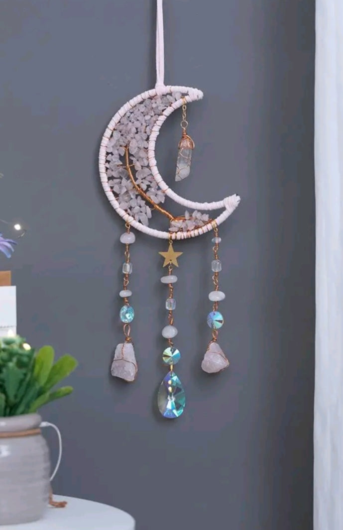 Invite light, love, and renewal into your space with this enchanting Moon Goddess Crystal Suncatcher. Featuring rose quartz, the stone of unconditional love and emotional healing, this piece radiates gentle energy and harmony. The crescent moon symbolizes new beginnings and spiritual protection, making it a meaningful addition to any sacred space or home decor.