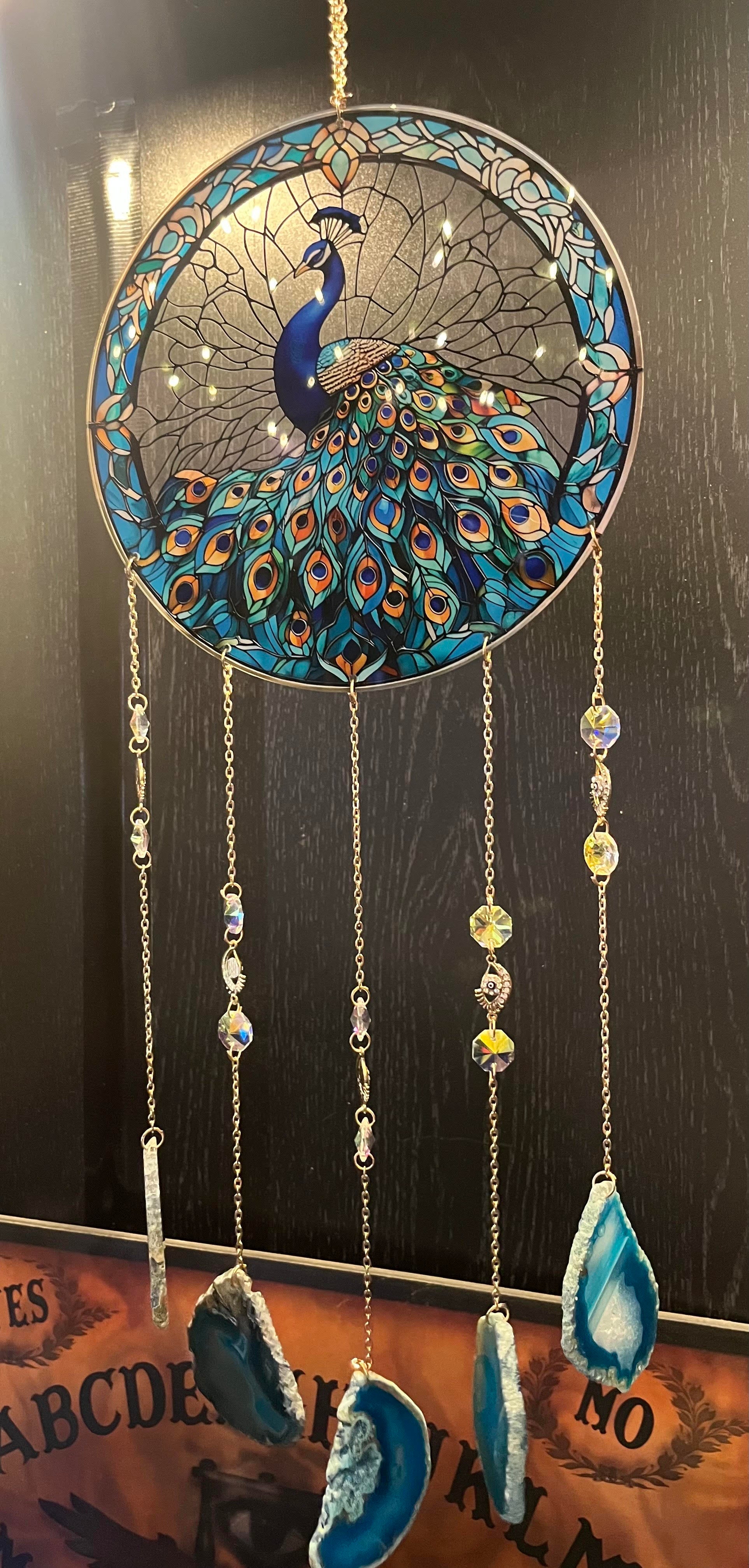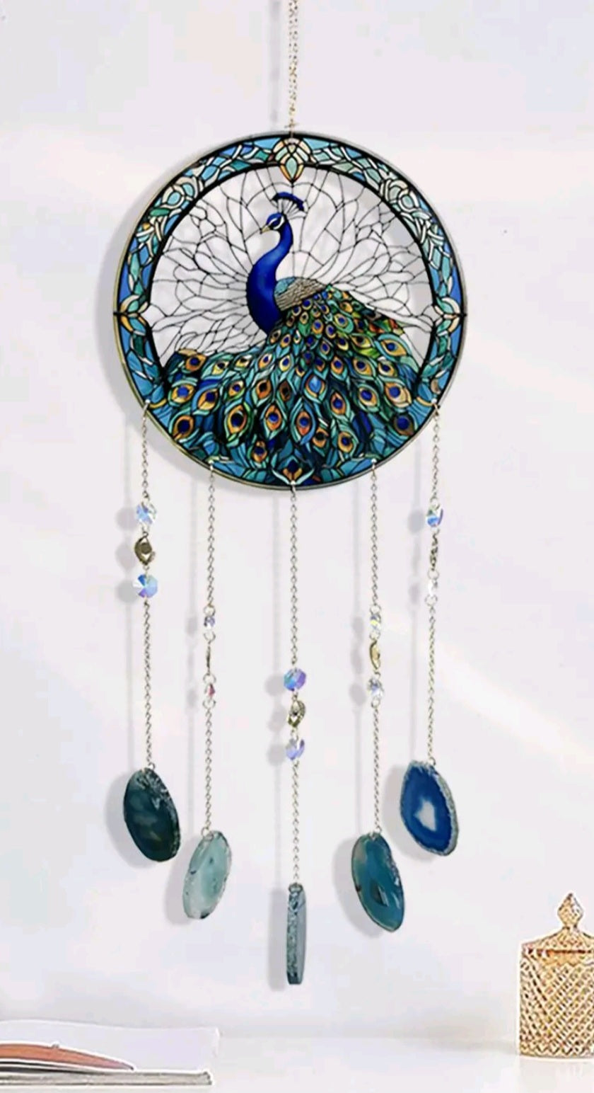 Bring color, elegance, and light into your space with this stunning Peacock Suncatcher. Featuring a beautifully detailed peacock design with flowing stained-glass-style feathers, this piece captures the iridescent beauty and symbolic power of the peacock—a symbol of vision, awakening, and self-expression.
