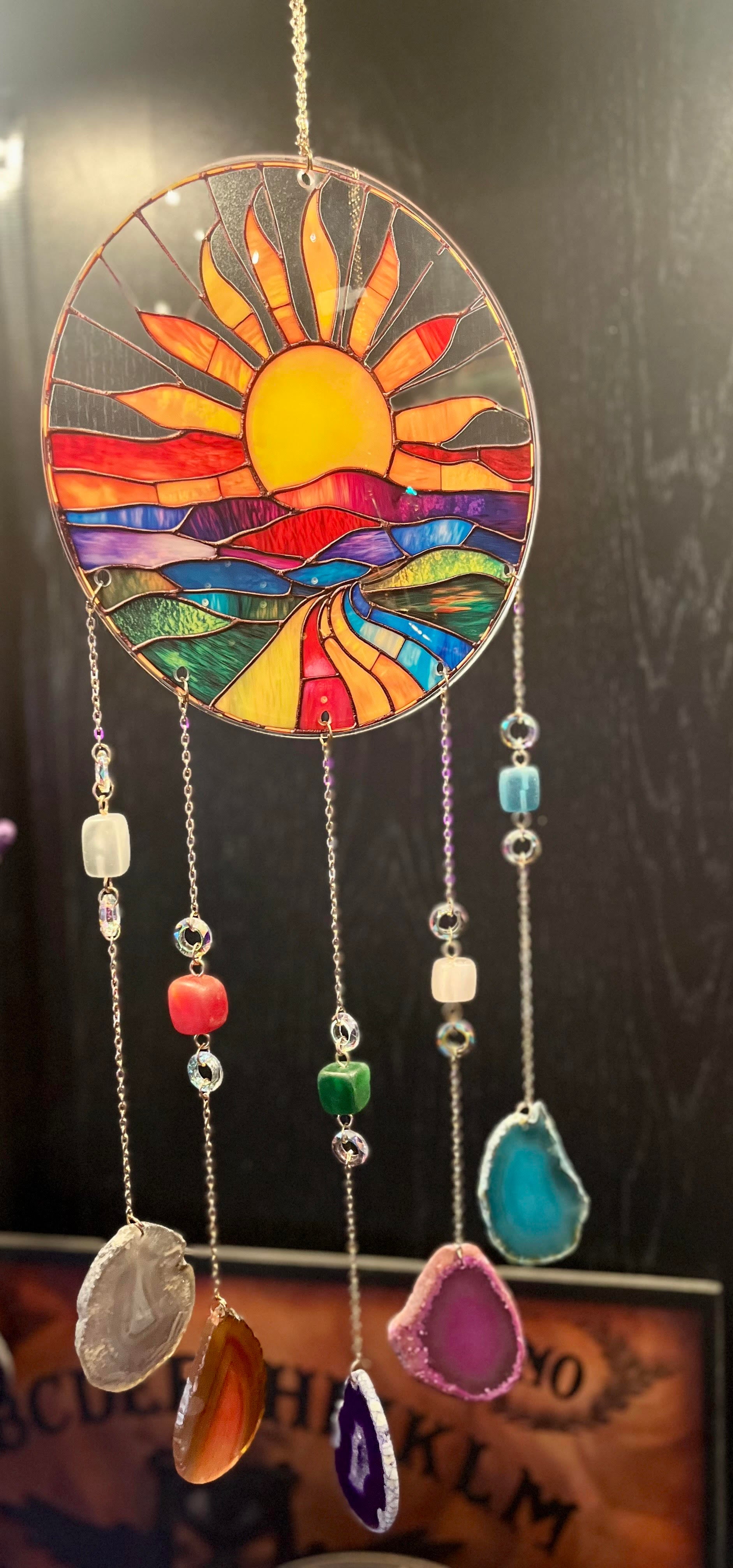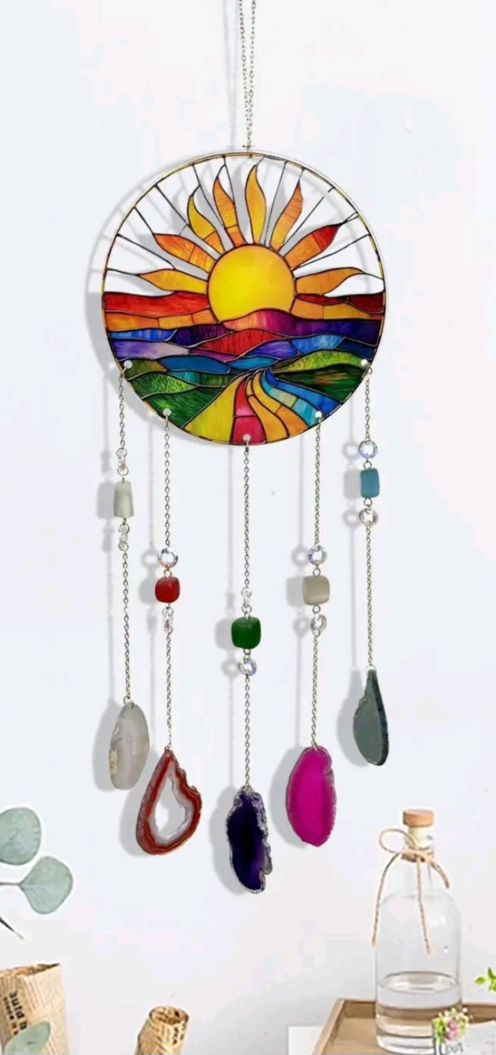 This enchanting suncatcher is a radiant blend of light and earth, designed to bring warmth and serenity into your space. A tranquil stained glass landscape captures the vivid colors and peaceful beauty of a sunrise, while colorful agate slices dangle gracefully, adding a natural, grounding touch.